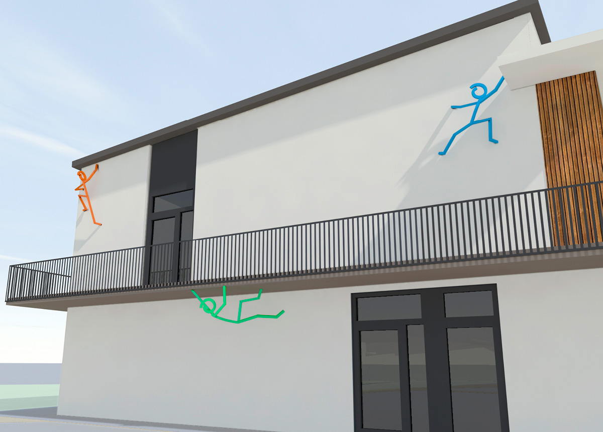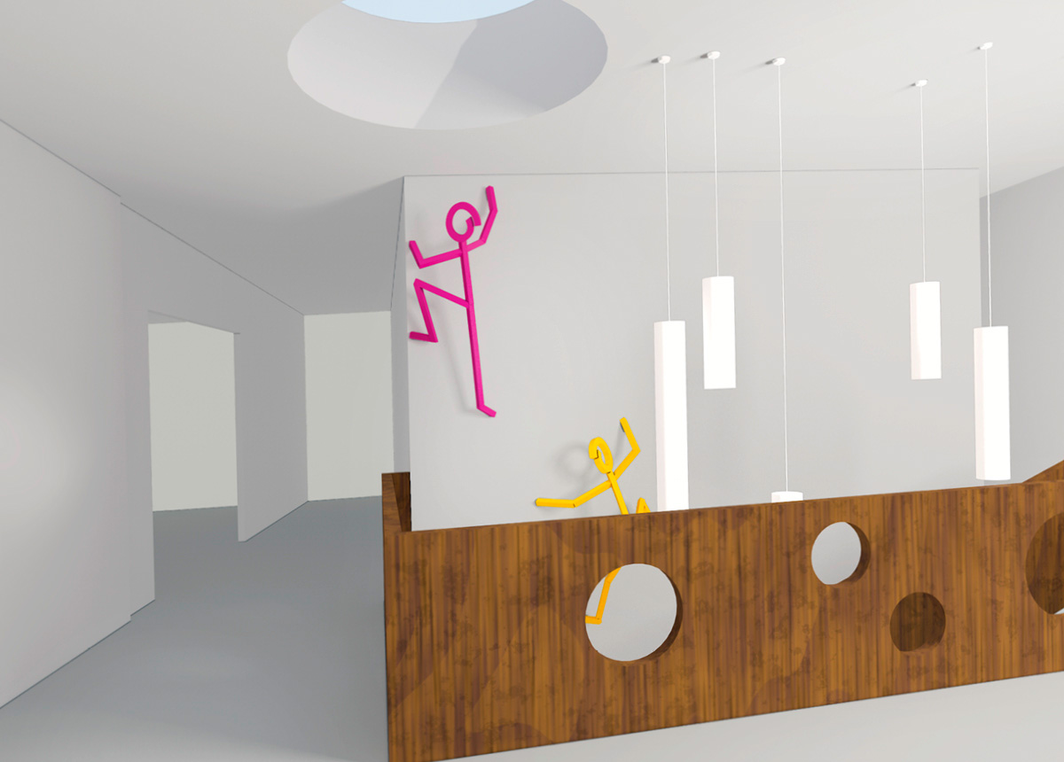 Das Kunstkonzept greift diese Aspekte auf. Die Felsen und das Thema Bewegung bilden den Hintergrund für das Kunstkonzept mit dem Titel „Die Klettis“. Die Idee sind Kletterfiguren in einer minimalistischen Formensprache, die die Kita in einen Kletterfelsen verwandeln. Die Klettis sind ausdruckstarke Akteure, dynamisch bewegen sie sich außen und innen und erklimmen in verschiedensten Kletterpositionen Wände und Decken der Kita. So erleben die Kinder die Faszination der Bewegung auf einzigartige Weise.
