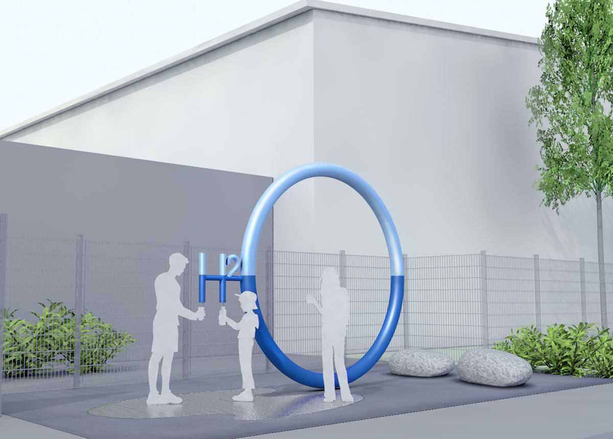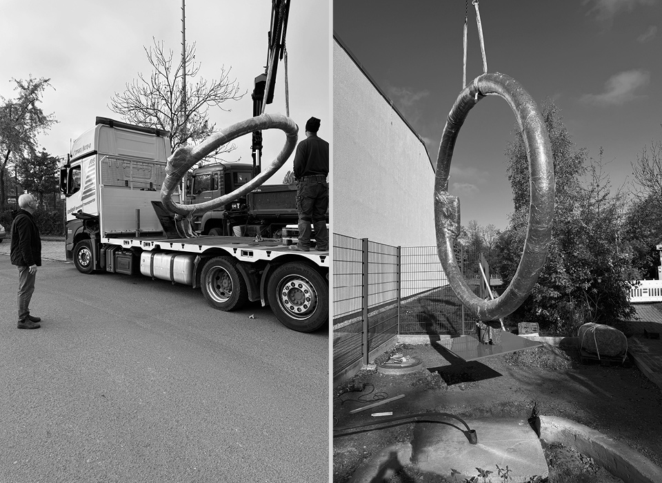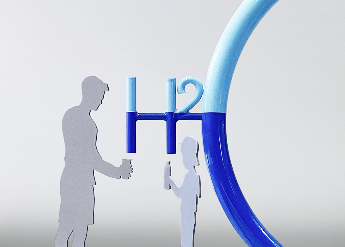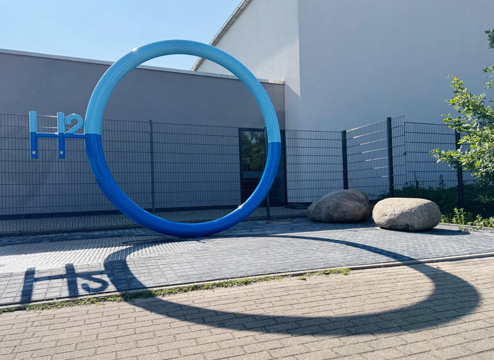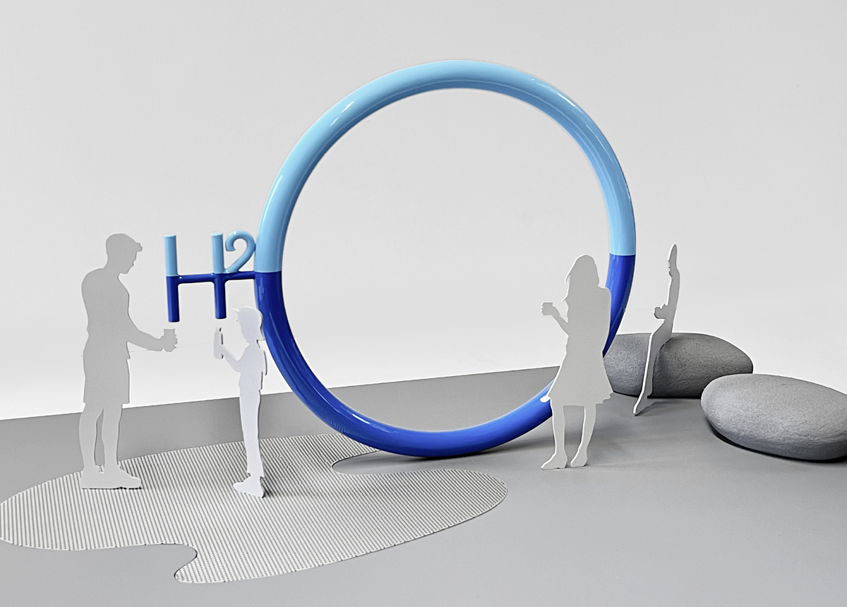 Ein senkrecht stehender 3 m hoher Kreisring erzeugt durch das tangentiale Momentum eine Dynamisierung der O-Form, die Bewegung, Energie und Aktivität assoziiert. Durch die unterschiedlichen Dimensionen von H2 und O entsteht eine spannungsvolle, kreative Konnexion. H und 2 werden zu funktionalen Elementen des Kunstobjekts: H wird zur Trinkwasserentnahme, 2 schafft die Verbindung zur Quelle. Jenseits seiner funktionalen Rolle als Wasserspender wird der Trinkbrunnen zum künstlerischen Statement, das die Bedeutung von Wasser als essenzielles Element unterstreicht.