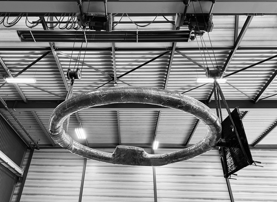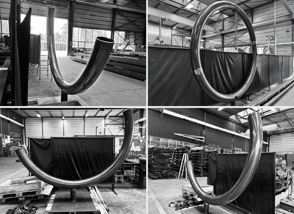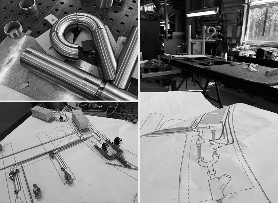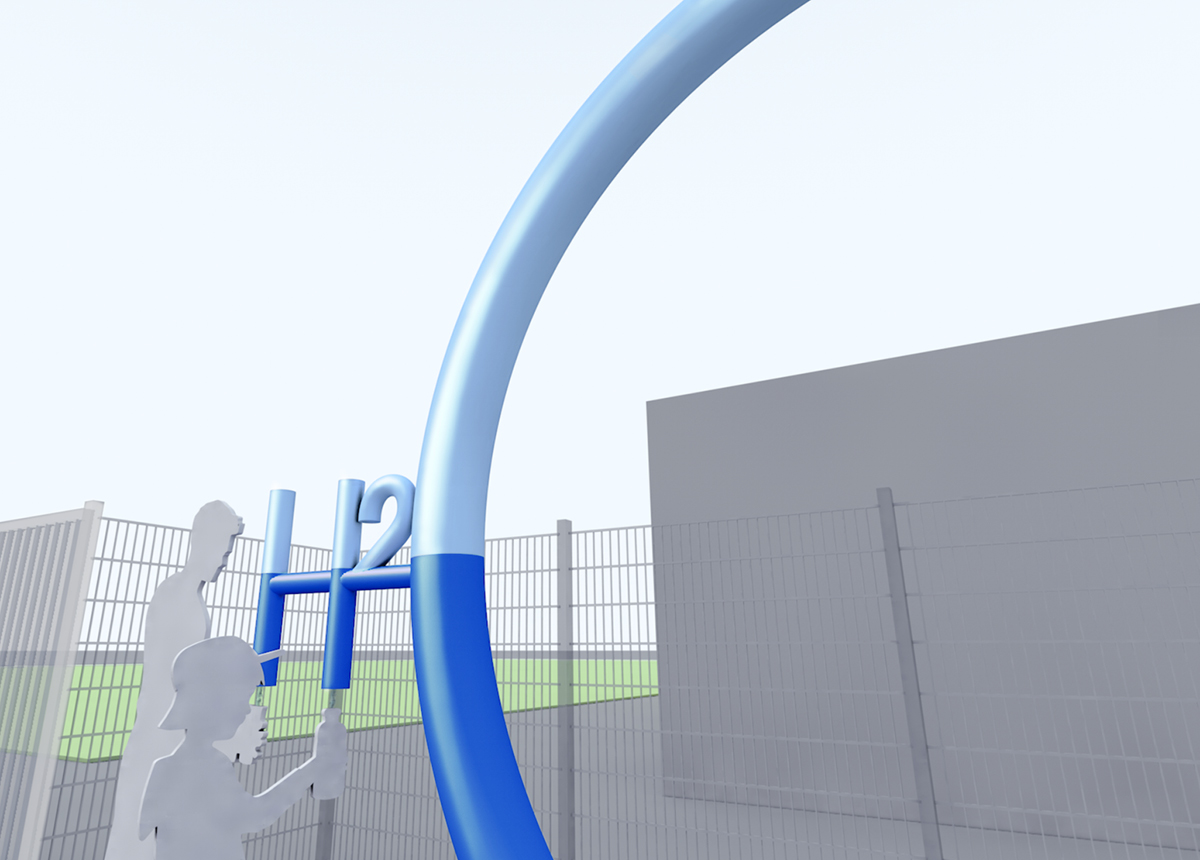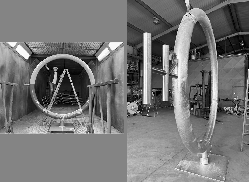 Ein senkrecht stehender 3 m hoher Kreisring erzeugt durch das tangentiale Momentum eine Dynamisierung der O-Form, die Bewegung, Energie und Aktivität assoziiert. Durch die unterschiedlichen Dimensionen von H2 und O entsteht eine spannungsvolle, kreative Konnexion. H und 2 werden zu funktionalen Elementen des Kunstobjekts: H wird zur Trinkwasserentnahme, 2 schafft die Verbindung zur Quelle. Jenseits seiner funktionalen Rolle als Wasserspender wird der Trinkbrunnen zum künstlerischen Statement, das die Bedeutung von Wasser als essenzielles Element unterstreicht.