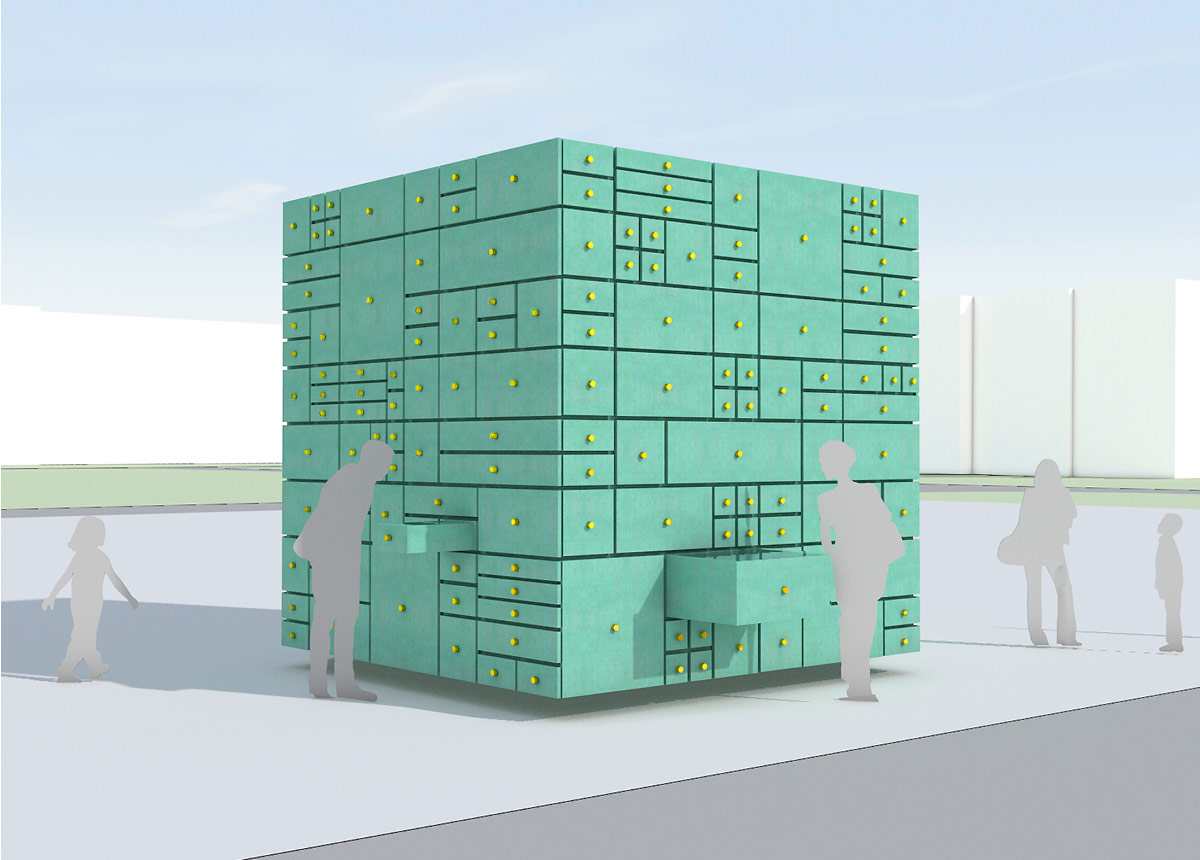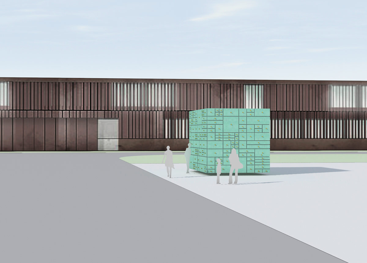 Das gewählte Material für das Kunstobjekt ist grün vorpatiniertes Kupfer. Es verkörpert nicht nur die Langlebigkeit und Wertigkeit von Artefakten, sondern steht auch für die Patina der Zeit, für die Spuren der Geschichte. Die Griffe in leuchtendem Messinggold betonen die Wertigkeit der Inhalte.