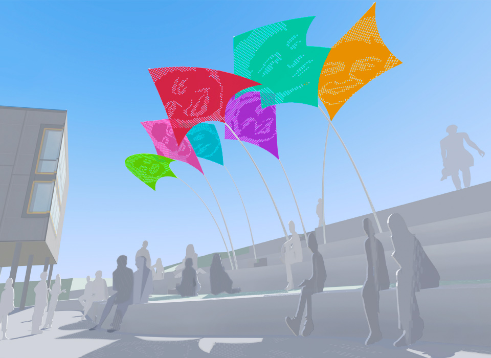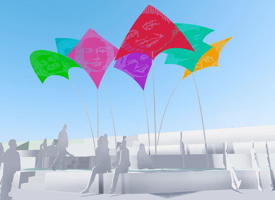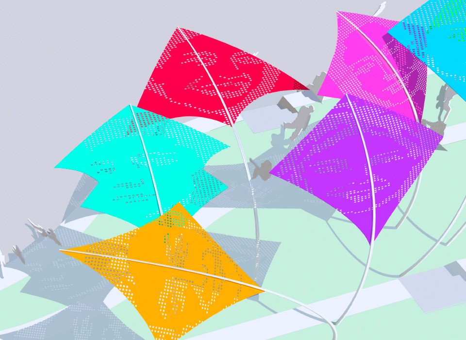 Die skulpturalen Objekte spenden Schatten und strukturieren den Raum, ohne ihn zu beschweren. Ihre Leichtigkeit im Zusammenspiel mit der Höhe der Masten lässt eine offene, einladende Atmosphäre entstehen, die zur Interaktion, zum Innehalten und zur Reflexion einlädt.