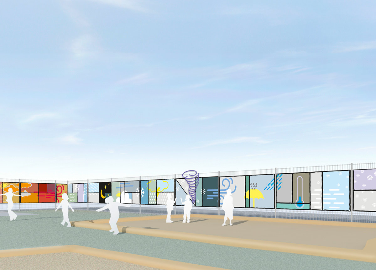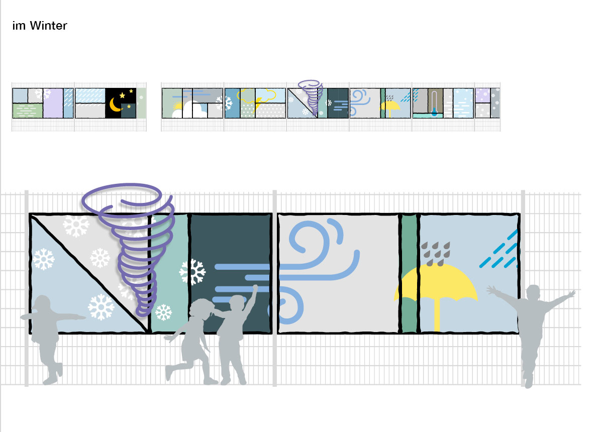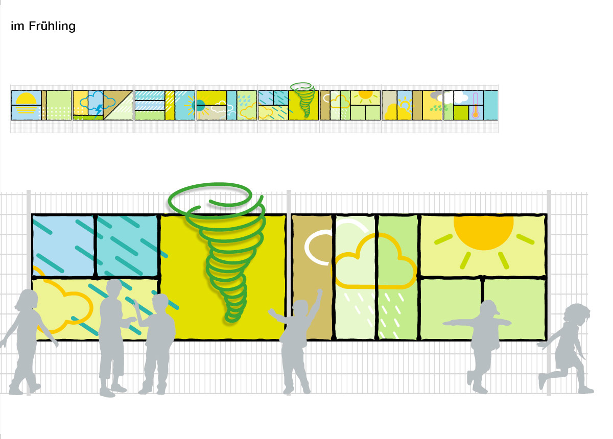 Die Kita „Wirbelwind“ trägt einen Namen, der Emotionen und Assoziationen weckt. Der Name ruft Bilder von weiteren Wetterphänomenen hervor. Diesen Aspekt greift das Kunstkonzept auf. Die Idee ist eine Kunstinstallation, die den Kindern mit einfachen und anschaulichen Bildern das Wetter ganz nebenbei näherbringt.