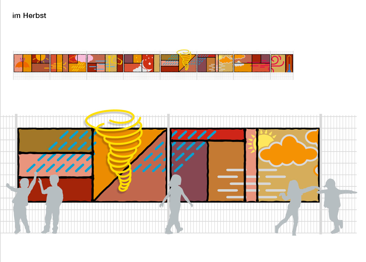 Die Integration der Wetterereignisse in den Jahresablauf verleiht dem Kunstkonzept eine zusätzliche Erlebnisdimension. Die vier Jahreszeiten als gestalterische Komponente lassen die Kinder die Veränderung der Umgebung wahrnehmen, was ihr Verständnis für den Zyklus der Natur vertieft. Die Kunstinstallation in ihrer Gesamtlänge von ca. 85 m teilt sich in vier Abschnitte: den Frühling, den Sommer, den Herbst und den Winter.