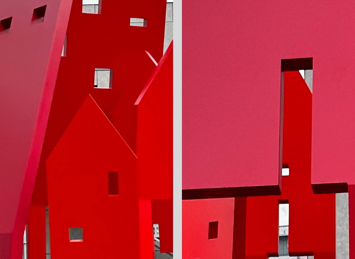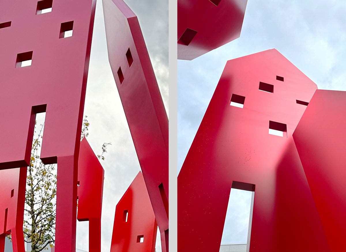 Die Farbgestaltung der Kunstobjekte ist in kraftvollen Rottönen gehalten. Rot als Verkörperung von Dynamik, Wärme, Präsenz und vitaler Lebensfreude.