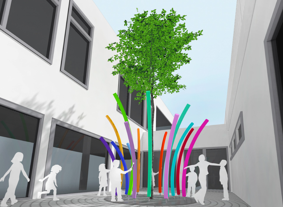 Das Kunstkonzept Klangblüte ist eine interaktive Klangskulptur. Die Idee ist eine Kunstinstallation aus verschiedenen Klangröhren, die die Kinder ermuntert, die Freude an Musik und Klang zu entdecken – eine begehbare Klangskulptur, bestehend aus einer Vielzahl unterschiedlich hoher Aluminiumröhren, die, in schwungvollen Bogen geformt, an eine Blüte erinnert, die sich öffnet.