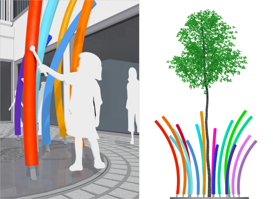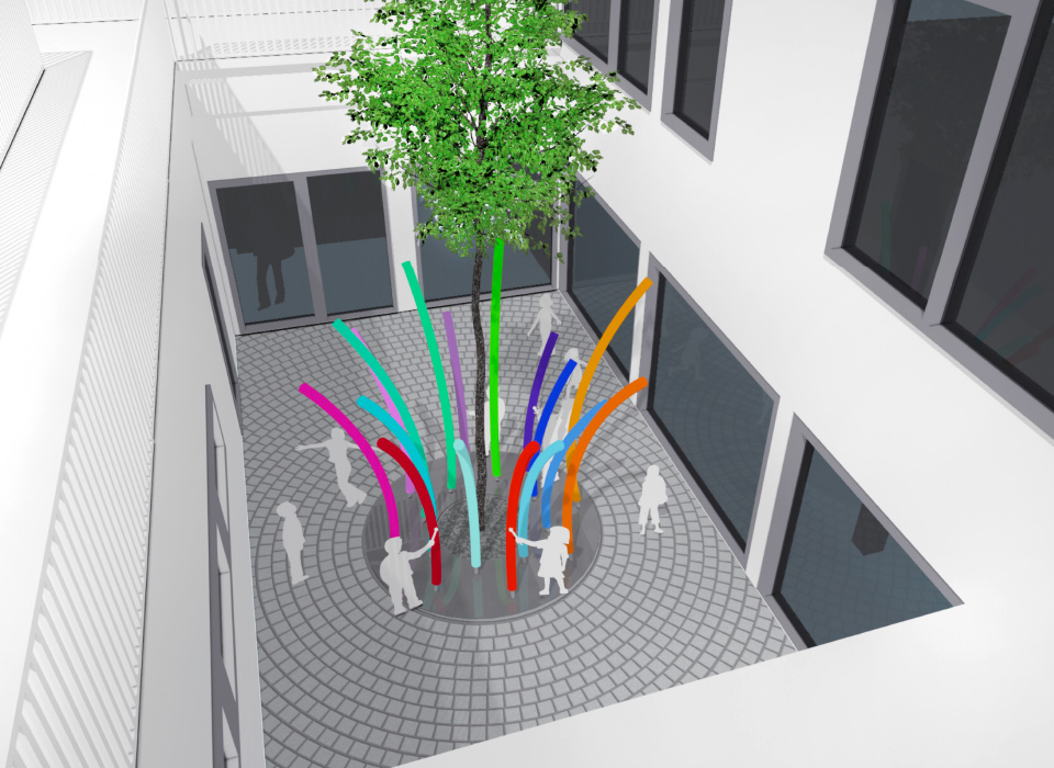 Die farbenfrohen Klangröhren erzeugen harmonische Klänge, die eine Tonleiter bilden und den Innenhof zu einem Klangraum werden lassen. Das in Kreisringen verlegte Betonpflaster erzeugt optisch ein Bild von Klangwellen.