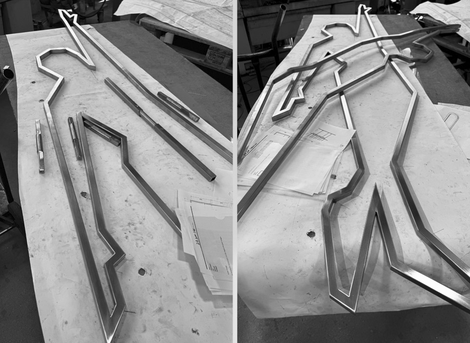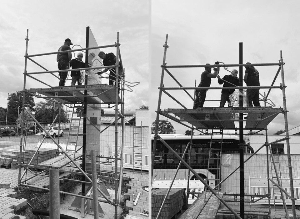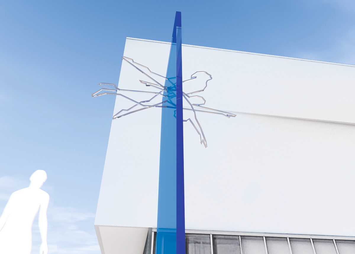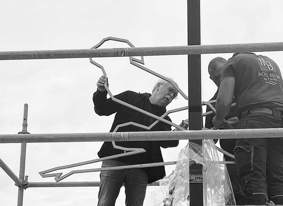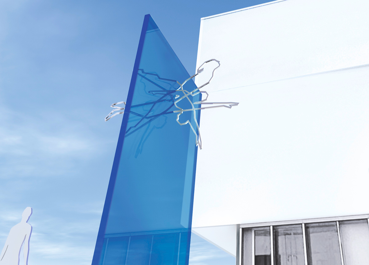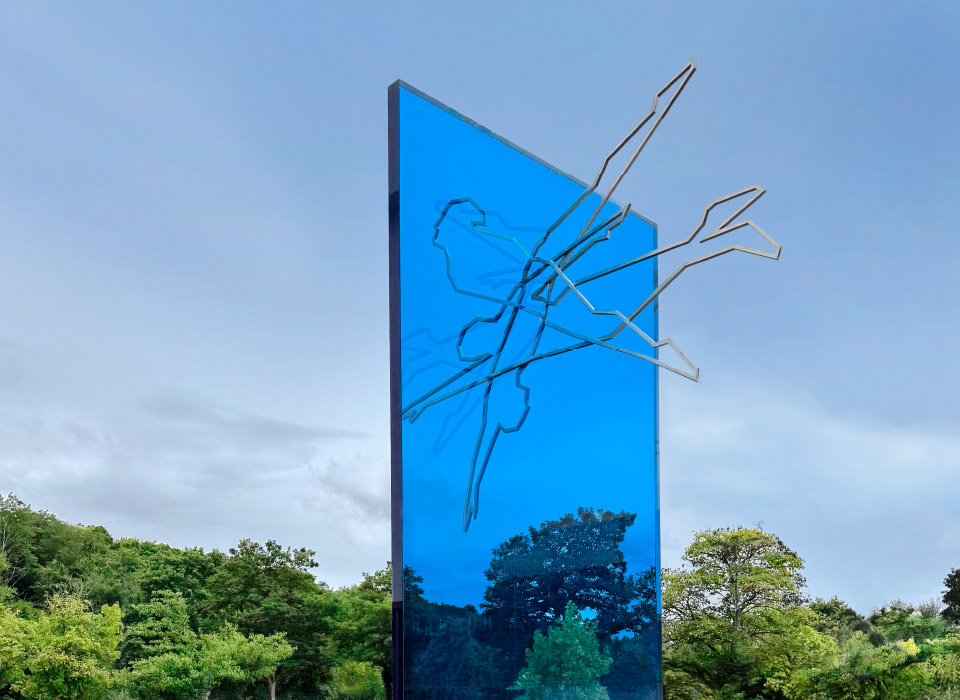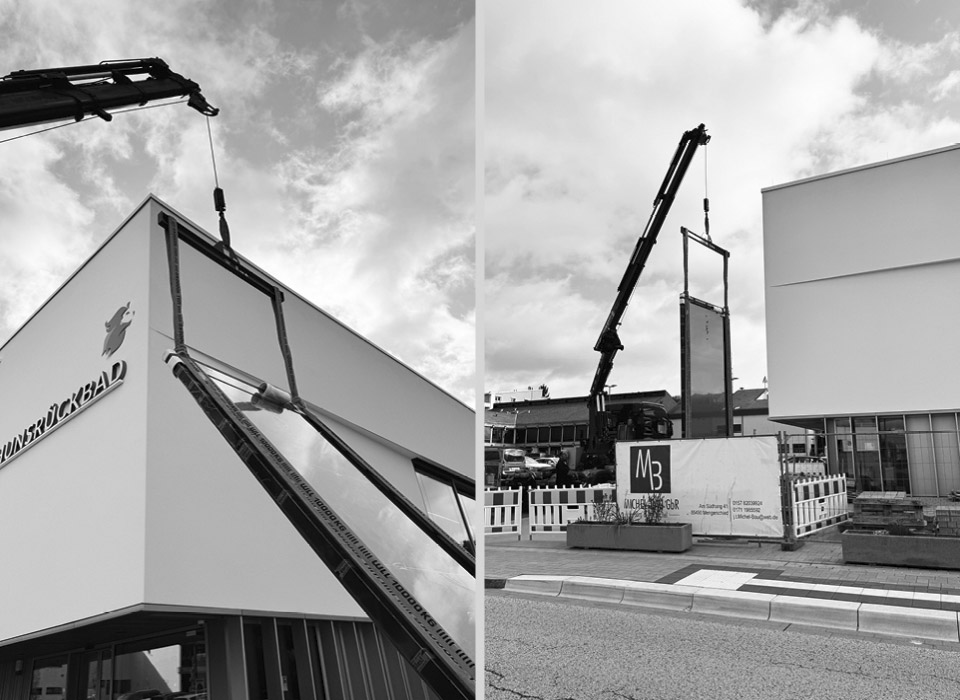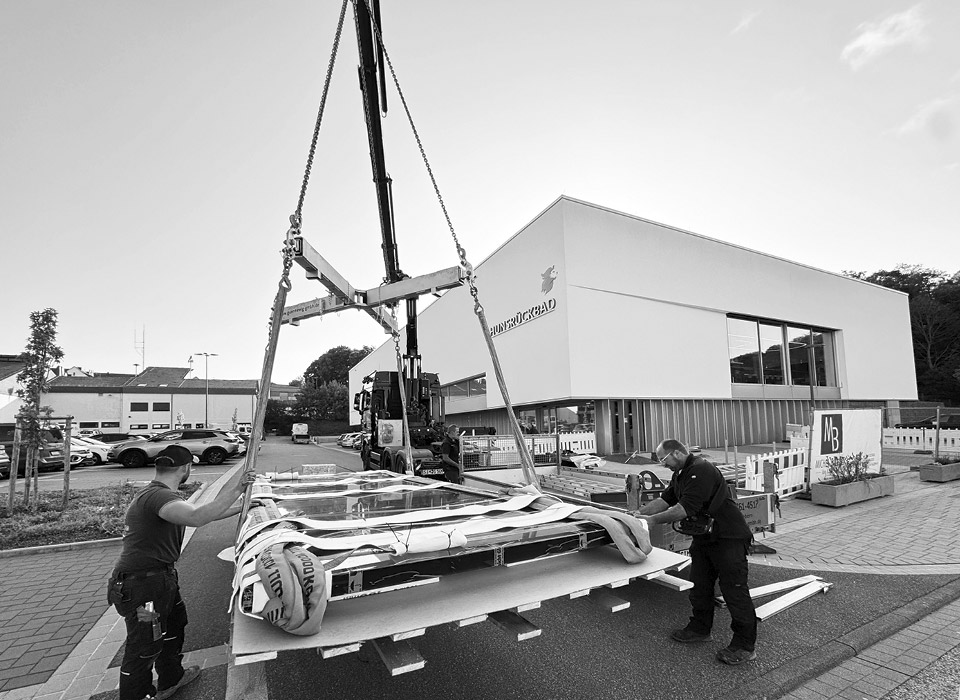 Die konturierte Darstellung der Figuren aus polierten Edelstahlprofilen betont den sportlichen Aspekt des Hunsrückbades. Die klaren Linien und kraftvollen Posen der Figuren stehen für die Präzision und Technik des Schwimmens.
