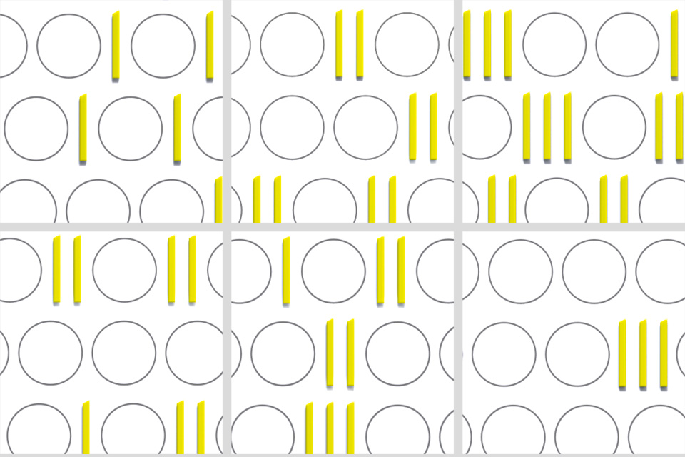Der Binär-Code wird animiert und interpretiert. Auf den Innenhöfen enthält die Abfolge der Zeichen eine starke Bewegungsenergie. Während die Kreise zu rollen scheinen und sich in die Tiefe gestaffelt sogar überholen, fungieren die Geraden als Rhythmusgeber. Die Farbdramaturgie unterstützt die Bewegung durch die Sequenz von Graustufen zu immer wärmeren Farbtönen – mit einem Zenit höchster Helligkeit in der Mitte.