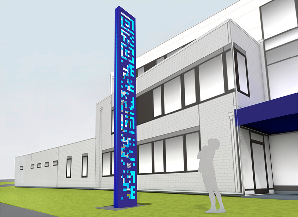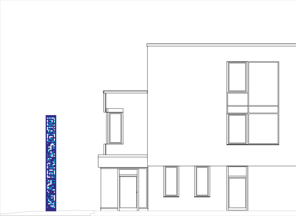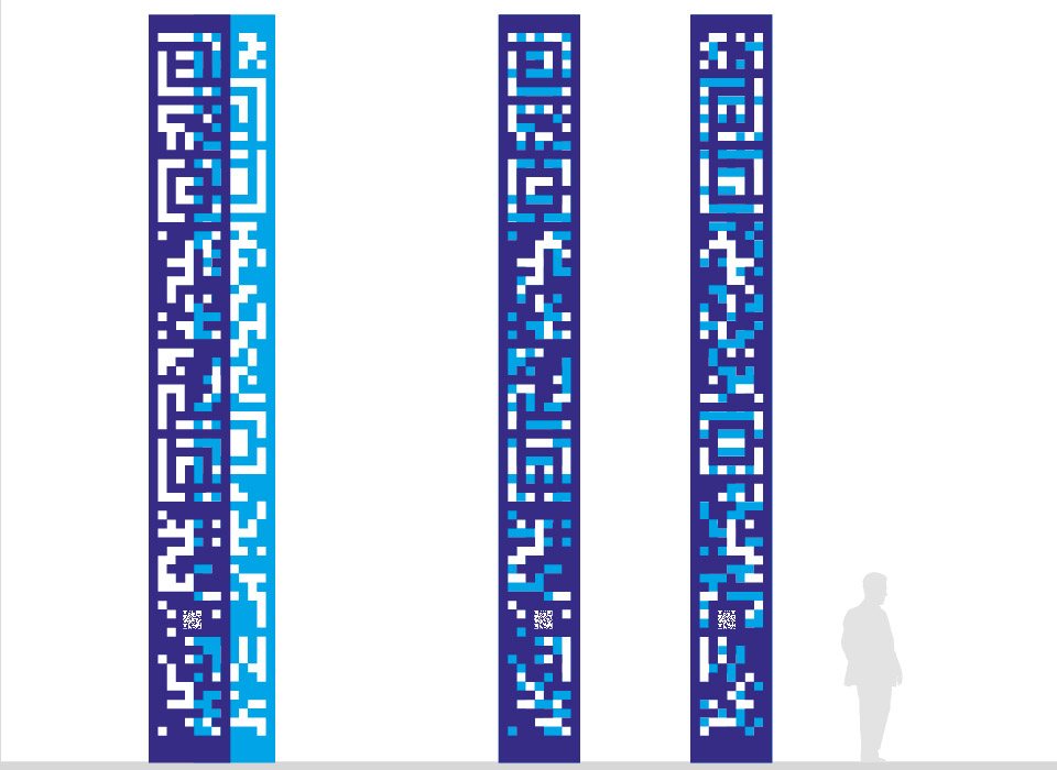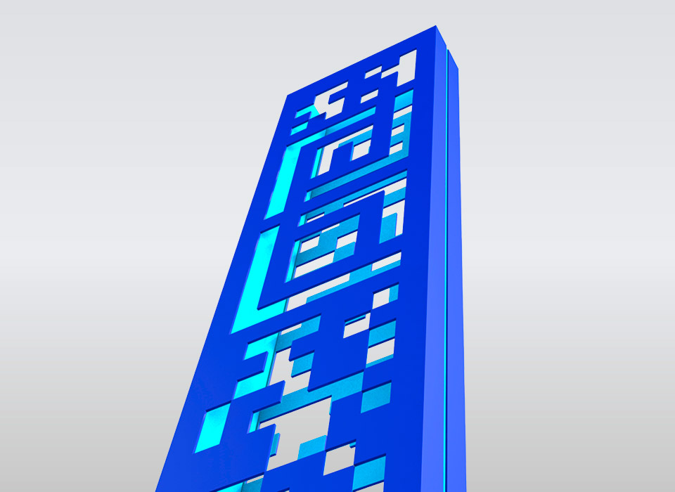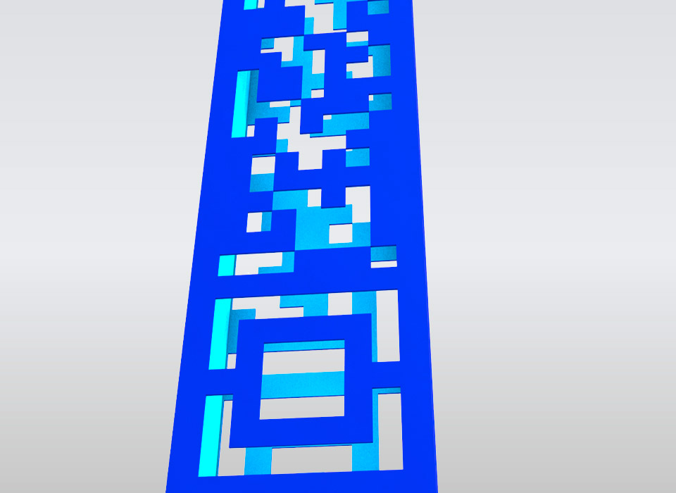 Die Säule bestehend aus einem ultramarinblauen Mantel und einem leuchtend cyanfarbigen Inneren zeigt die künstlerische Interpretation des Codes. Die Formelemente als gelaserte Ausschnitte erzeugen durch die Licht- und Schatteneffekte eine besondere dreidimensionale Wirkung und Ästhetik. Das skulpturale Geschehen wird bestimmt durch ein spannungsvolles Zusammenspiel der Formen, die Strukturen assoziieren Datenkommunikation, lebendigen Organismus, urbane Strukturen, vernetzte Welten.