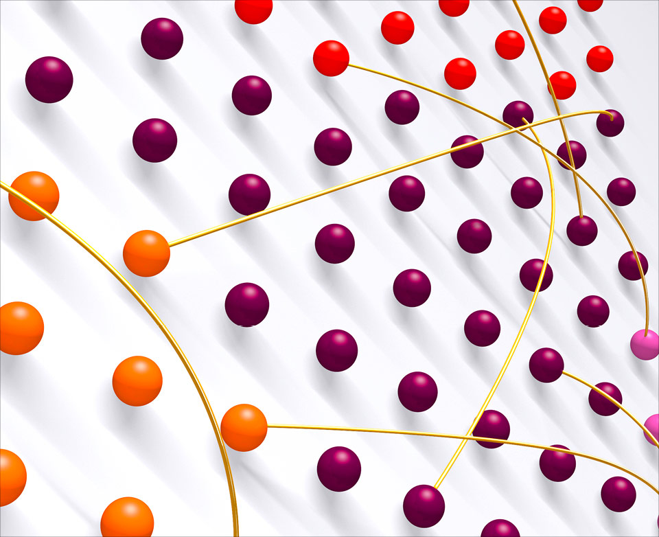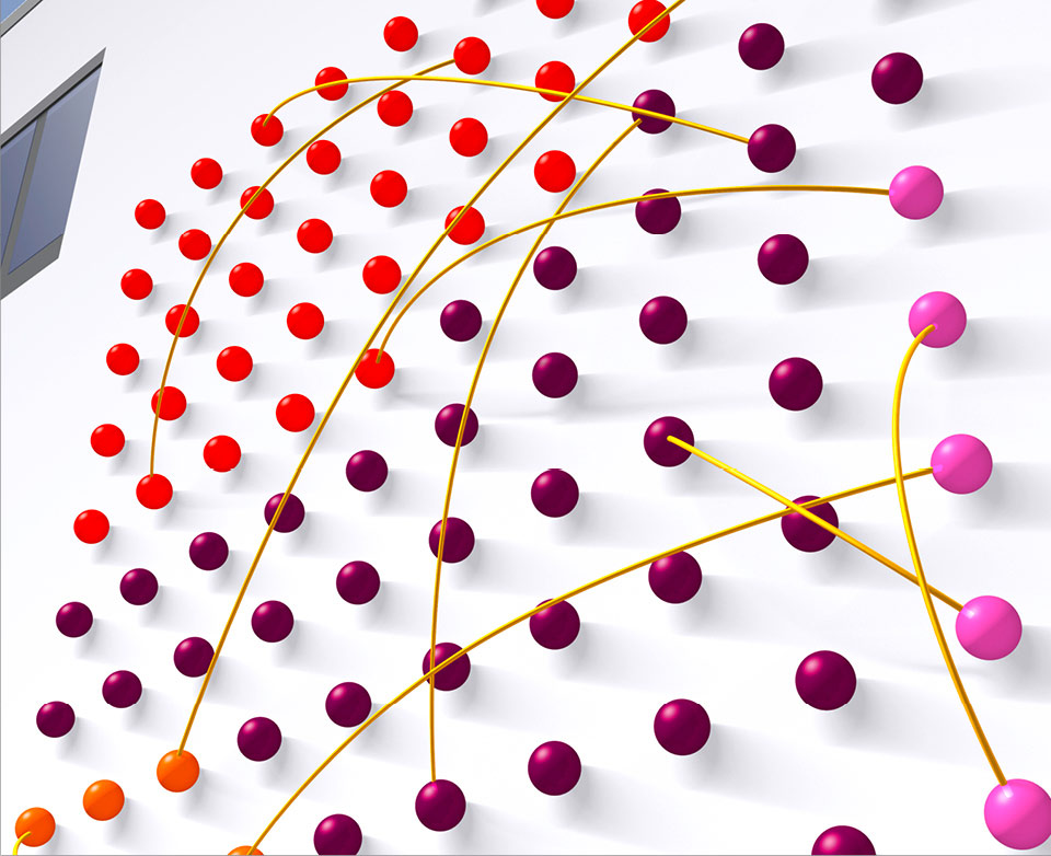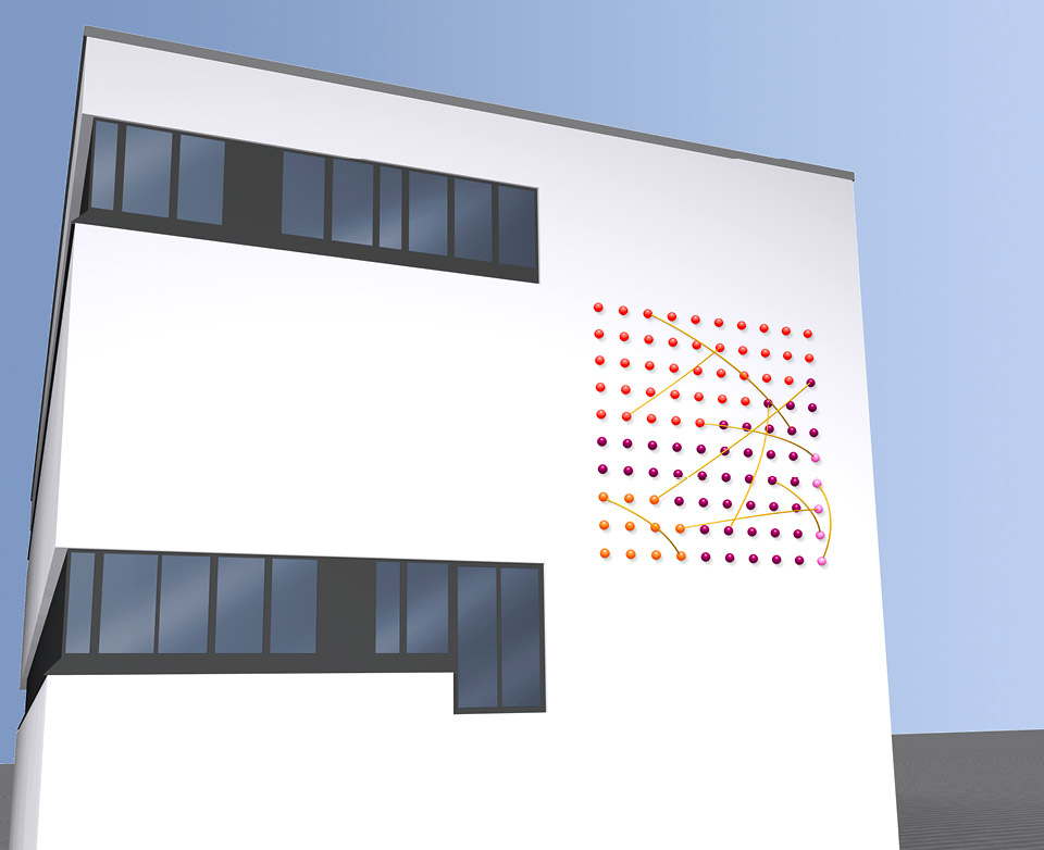 Die Kugeln, die tangential auf der weiß geputzten Wandfläche unsichtbar verschraubt sind, bilden in ihrer geometrischen Ordnung ein Kraftfeld, das durch 9 sich überschneidende Verbindungsstränge dynamisiert wird. Zwischen verschiedenen Kugelpaaren spannen sich diese Verbindungsbögen in leuchtendem Gold. Sie stehen sinnbildlich für Transfusion, für Kompatibilität und das Verbindende von Spender und Empfänger. Gold assoziiert Wertvolles und Kostbares.