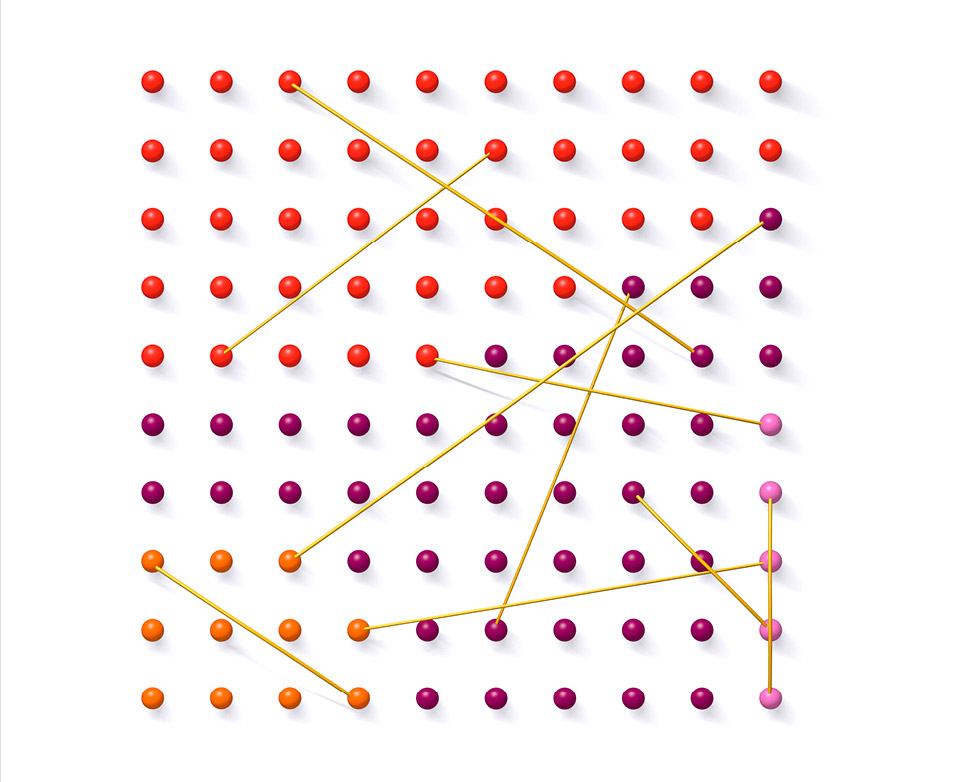 Die künstlerische Idee ist eine Wand-Installation aus 100 Kugeln, die in vier verschiedenen Rottönen erstrahlen. 41 in signalrot, 11 in orangerot, 5 in magenta und 43 in purpurrot. Rot als die Farbe für Lebenskraft und Energie.